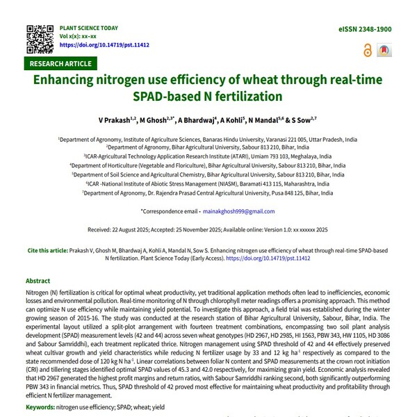 Nitrogen (N) fertilization is critical for optimal wheat productivity, yet traditional application methods often lead to inefficiencies, economic losses and environmental pollution. Real-time monitoring of N through chlorophyll meter readings offers a promising approach. This method can optimize N use efficiency while maintaining yield potential. To investigate this approach, a field trial was established during the winter growing season of 2015-16. The study was conducted at the research station of Bihar Agricultural University, Sabour, Bihar, India. The experimental layout utilized a split-plot arrangement with fourteen treatment combinations, encompassing two soil plant analysis development (SPAD) measurement levels (42 and 44) across seven wheat genotypes (HD 2967, HD 2985, HI 1563, PBW 343, HW 1105, HD 3086 and Sabour Samriddhi), each treatment replicated thrice. Nitrogen management using SPAD threshold of 42 and 44 effectively preserved wheat cultivar growth and yield characteristics while reducing N fertilizer usage by 33 and 12 kg ha-1 respectively as compared to the state recommended dose of 120 kg N ha-1. Linear correlations between foliar N content and SPAD measurements at the crown root initiation (CRI) and tillering stages identified optimal SPAD values of 45.3 and 42.0 respectively, for maximizing grain yield. Economic analysis revealed that HD 2967 generated the highest profit margins and return ratios, with Sabour Samriddhi ranking second, both significantly outperforming PBW 343 in financial metrics. Thus, SPAD threshold of 42 proved most effective for maintaining wheat productivity and profitability through efficient N fertilizer management.