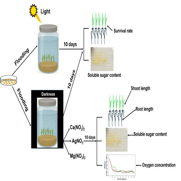 Flooding significantly affects rice survival due to fast oxygen depletion, and the possible use of nitrate (NO3-) as an alternate terminal electron acceptor to enable anaerobic metabolism remains little investigated. In particular, the efficiency of different NO3 - compounds in increasing submergence tolerance across different rice cultivars has received little attention. Six rice cultivars-OM4900, OM6976, OM4218, IR50404, OM7347 and IR64Sub1-were tested for their flooding responses during 5-10 and 15-day submergence periods in dark conditions. Additionally, the effects of exogenous NO3 - treatments on seedling survival were evaluated. After 5 days, IR64Sub1, OM7347 and OM4900 exhibited the highest survival rates (86, 83 and 81 %, respectively). Survival sharply decreased after 10 days, with most cultivars falling below 26 %, except OM7347 and IR64Sub1, which were reduced to 38.7 and 30.7 %, respectively. At 15 days, survival was ≤10 % for all lines. Light significantly improved survival (72.91 %) compared with dark conditions (12.31 %), and darkness induced a 142.252 % increase in soluble sugar levels, demonstrating the importance of carbohydrate reserves under hypoxia. Application of 3 mg L-1 calcium nitrate (Ca(NO3)2) increased survival after 10-day submergence by 47.7 % in OM4218, 53 % in OM4900, and 40 % in IR64Sub1, while silver nitrate (AgNO3) stimulated shoot elongation (up to 4.42 cm). Calcium nitrate also increased soluble sugar accumulation to 2.91.5.31 mg g-1 dry weight (DW). Dissolved oxygen measurements showed delayed oxygen depletion under Ca(NO3)2 and elevated oxygen availability with AgNO3. These results highlight the novel role of NO3 - compounds in enhancing rice submergence tolerance and provide a foundation for further elucidation of NO3- mediated mechanisms of anaerobic survival.