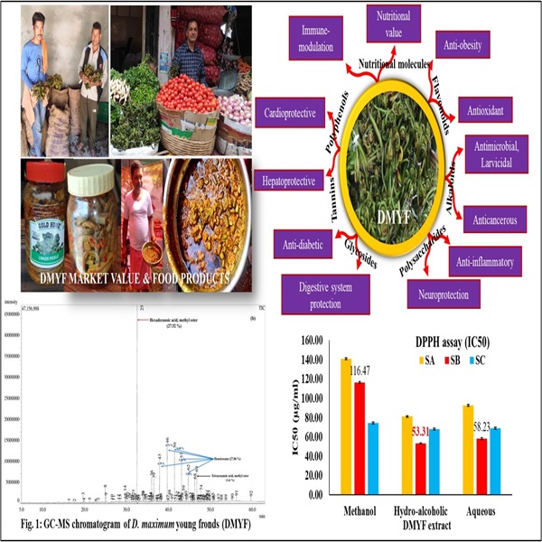 A comparative assessment of Diplazium maximum (D. Don) C. Chr. young edible fronds revealed significant variations (p ≤ 0.05) in nutritional and bioactive properties across Shimla (SA), Mandi (SB) and Chamba districts (SC) of Himachal Pradesh. SC and SB fronds exhibited the highest content of moisture (92.78 %), total energy (1353.61 KJ/100 g), crude fat (2.86 %), total ash (12.64 %) and total carbohydrates (50.78 %), dietary fiber (40.54 %), total soluble sugar (1.60 %), respectively. The significantly highest (p ≤ 0.05) protein (28.02 %), calcium ( Ca 0.12 %), iron (Fe 0.0157 %), copper (Cu 0.0026 %) and manganese (Mn 0.0021 %) content was recorded at SA. Antioxidant profiling showed the significant activity in SB hydro-alcoholic extract, demonstrating the lowest IC50 values (53.31 and 50.69 µg/mL) for 2, 2-Diphenyl-1-picrylhydrazyl (DPPH) and 2,2’-azino-bis-3-ethylbenzthiazoline-6-sulfonic acid (ABTS) assays corresponding to the highest total phenolics (TP=90.71 mg GAE/g) and flavonoids (TF=75.65 mg QE/g) concentration. Phytochemicals screening also confirmed the presence of alkaloids, phenolics, flavonoids, terpenoids, glycosides, tannins and saponins. Total chlorophyll (50.53 µg/100 g) and total carotenoids (7.48 µg/100 g) content varied significantly (p ≤ 0.05) across all sites, being highest in SB and SC fronds respectively. Fatty acids profiling through gas chromatography-mu ass spectrometry (GC-MS) revealed dominance of methyl palmitate (85.5 %) and methyl lignocarate (18.97 %). Overall, D. maximum fronds exhibit strong nutritional, bioactive and antioxidant potential, supporting their value as a sustainable wild edible resource for enhancing food security and future nutraceutical applications.