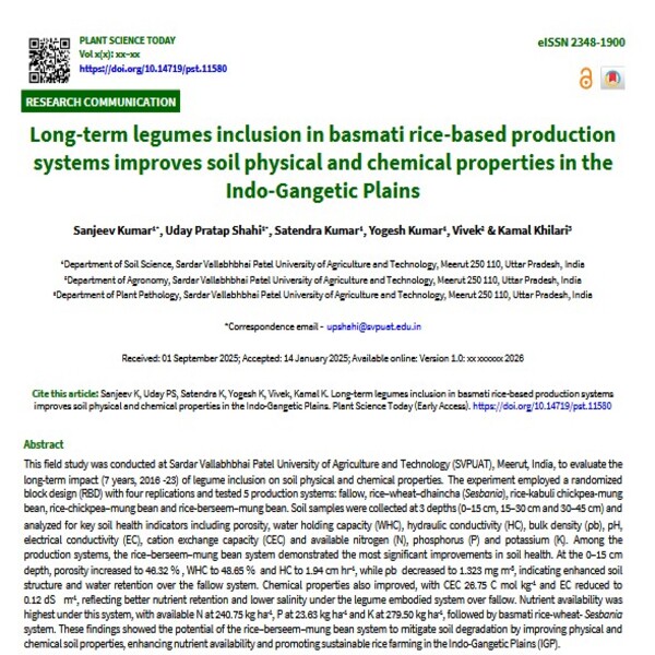 This field study was conducted at Sardar Vallabhbhai Patel University of Agriculture and Technology (SVPUAT), Meerut, India, to evaluate the long-term impact (7 years, 2016 -23) of legume inclusion on soil physical and chemical properties. The experiment employed a randomized block design (RBD) with four replications and tested 5 production systems: fallow, rice–wheat–dhaincha (Sesbania), rice-kabuli chickpea-mung bean, rice-chickpea–mung bean and rice-berseem–mung bean. Soil samples were collected at 3 depths (0–15 cm, 15–30 cm and 30–45 cm) and analyzed for key soil health indicators including porosity, water holding capacity (WHC), hydraulic conductivity (HC), bulk density (ρb), pH, electrical conductivity (EC), cation exchange capacity (CEC) and available nitrogen (N), phosphorus (P) and potassium (K). Among the production systems, the rice–berseem–mung bean system demonstrated the most significant improvements in soil health. At the 0–15 cm depth, porosity increased to 46.32 % , WHC to 48.65 % and HC to 1.94 cm hr-1, while ρb decreased to 1.323 mg m-3, indicating enhanced soil structure and water retention over the fallow system. Chemical properties also improved, with CEC 26.75 C mol kg-1 and EC reduced to 0.12 dS m-1, reflecting better nutrient retention and lower salinity under the legume embodied system over fallow. Nutrient availability was highest under this system, with available N at 240.75 kg ha-1, P at 23.63 kg ha-1 and K at 279.50 kg ha-1, followed by basmati rice-wheat- Sesbania system. These findings showed the potential of the rice–berseem–mung bean system to mitigate soil degradation by improving physical and chemical soil properties, enhancing nutrient availability and promoting sustainable rice farming in the Indo-Gangetic Plains (IGP).