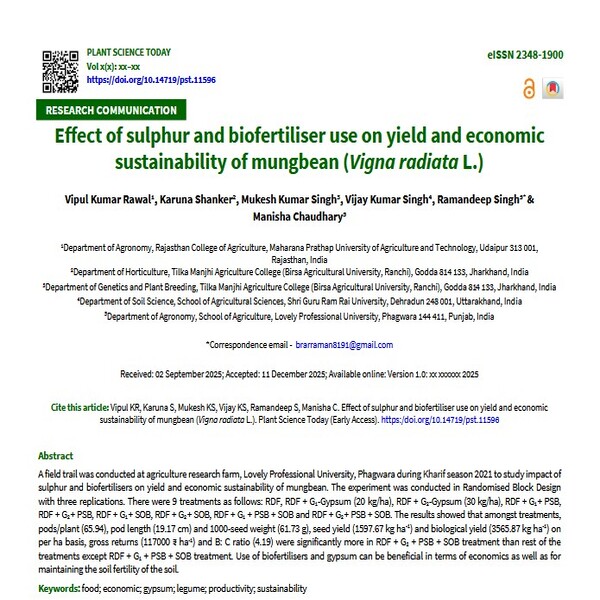 A field trail was conducted at agriculture research farm, Lovely Professional University, Phagwara during Kharif season 2021 to study impact of sulphur and biofertilisers on yield and economic sustainability of mungbean. The experiment was conducted in Randomised Block Design with three replications. There were 9 treatments as follows: RDF, RDF + G1-Gypsum (20 kg/ha), RDF + G2-Gypsum (30 kg/ha), RDF + G1 + PSB, RDF + G2 + PSB, RDF + G1 + SOB, RDF + G2 + SOB, RDF + G1 + PSB + SOB and RDF + G2 + PSB + SOB. The results showed that amongst treatments, pods/plant (65.94), pod length (19.17 cm) and 1000-seed weight (61.73 g), seed yield (1597.67 kg ha-1) and biological yield (3565.87 kg ha-1) on per ha basis, gross returns (117000 ₹ ha-1) and B: C ratio (4.19) were significantly more in RDF + G2 + PSB + SOB treatment than rest of the treatments except RDF + G1 + PSB + SOB treatment. Use of biofertilisers and gypsum can be beneficial in terms of economics as well as for maintaining the soil fertility of the soil.