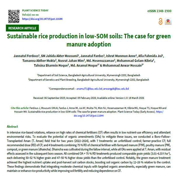 In intensive rice-based rotations, reliance on high rates of chemical fertilisers (CF) often results in low nutrient-use efficiency and attendant environmental risks. To evaluate the potential of organic amendments (OAs) to mitigate these issues, we conducted a Boro–Fallow–Transplanted Aman (T. Aman) field trial for two years (2022–2024), with 7 treatments: an unfertilised control; farmer-practice CF; full recommended dose (RD) of CF; and 4 treatments combining 75 % RD of chemical fertiliser with farmyard manure (FYM), poultry manure (PM), compost, or green manure (dhaincha). Dhaincha was cultivated during the fallow interval, while all OAs were applied at T. Aman, with residual effects assessed in the subsequent boro season. All combined OA + 75 % RD treatments produced comparable grain yields (3.01–6.33 t ha-1), each delivering 50–52 % higher grain and 47–50 % higher straw yields than the unfertilised control. Notably, the green manure treatment achieved the highest nutrient uptake and post-harvest soil carbon stocks, boosting soil organic carbon by 12–26 % relative to the control. These findings demonstrate that integrating moderate chemical inputs with targeted organic amendments, especially green manure, can maintain or enhance rice productivity while improving soil fertility and reducing dependence on CF.