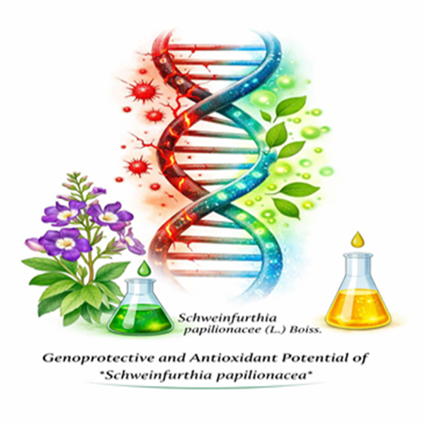 The genotoxic and antioxidant activities of methanolic and chloroform extracts of Schweinfurthia papilionacea (L.) Boiss was assessed using a comet assay on human lymphocyte genomic DNA and a 2,2-diphenyl-1-picryl hydrazyl (DPPH) radical-scavenging assay. The genotoxic activity of S. papilionacea showed that the methanolic extract exhibited dose-dependent genoprotection, i.e. 60.5 at 75 mg 100mL-1 and 103.6 at 100 mg 100mL-1, while the chloroform extract exhibited dose-dependent genoprotection, 92.2 at 75 mg/100mL and 109.7 at 100 mg 100mL-1. The antioxidant activity revealed that the methanolic extract of S. papilionacea showed the highest antioxidant activity (63.36 %) at 150 mg mL-1, while the chloroform extract of S. papilionacea exhibited the highest (% ) antioxidant activity (58.42 % ) at 150 µg mL-1, but less than the standard drug ascorbic acid (AA) (78.35 % ). The present results showed that S. papilionacea possess genoprotective and antioxidant properties and can be used to treat several diseases. However, further studies are also needed to understand the radical-scavenging and metal-chelating activities of plants in a concentration-dependent manner.