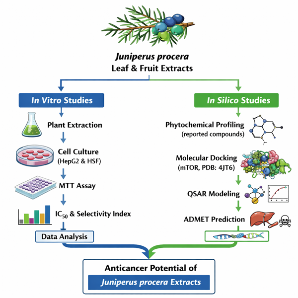 Although there is an increasing body of research focused on natural products for cancer treatment, the therapeutic capabilities of Juniperus procera especially in terms of a comparative analysis of its leaf and fruit extracts against liver cancer have not been thoroughly investigated. This study offers the first detailed examination that integrates both in vitro cytotoxicity assessments and in silico molecular modelling to uncover bioactive compounds from J. procera with targeted anticancer effects on human liver cancer cells (HepG2). The ethanolic extract from the leaves exhibited significant cytotoxicity (IC50 = 17.3 µg/mL), outperforming the fruit extract (IC50 = 24.4 µg/mL), while showing low toxicity to normal human fibroblasts (SI > 2). Molecular docking studies targeting mTOR (PDB: 4JT6) revealed Perylene and Podocarpusflavone A as promising high-affinity ligands (ΔG = -10.9 kcal/mol). Quantitative Structure-Activity Relationship (QSAR) modelling, supported by robust statistical validation (Q² = 0.649, R² = 0.831), indicated that Rutin is likely to exhibit the strongest inhibitory effect (IC50 = 0.011 nM). Additionally, cytotoxicity predictions using the CLC-Pred tool indicated a broad-spectrum efficacy of selected compounds across various liver cancer cell lines, particularly HepG2. This comprehensive approach underscores the potential of new lead compounds derived from J. procera and strongly supports the need for future in vivo and target-specific investigations in liver cancer treatment.