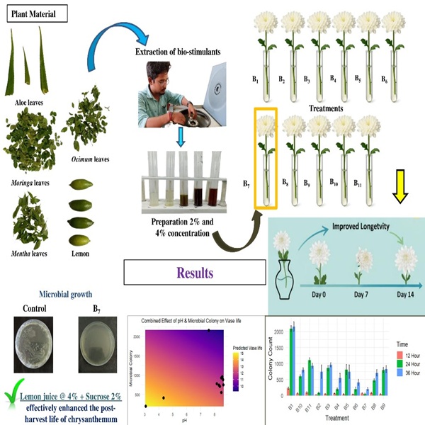 Quality and longer vase life are the most important factors in cut flowers, while chemicals are the reliable ones for enhancing both. To prevent chemical usage, the study was undertaken to evaluate biostimulants for enhancing the vase life of cut flowers. Eleven different treatment combinations of bio-stimulants were used in this experiment to study their effect in enhancing the vase life of chrysanthemum, where extracts of aloe vera, Ocimum gratissimum leaves, lemon juice, Mentha piperita leaves and Moringa olerifera leaves were used at 2 % and 4 % concentration along with 2 % sucrose. The experiment was laid out in a completely randomized design replicated thrice and in each treatment, 10 flowers were used. Chrysanthemum var. Snowball was used in this experiment. Lemon juice at 4 % + Sucrose 2 % (B7) recorded the maximum vase life (14.94, 15.15 and 15.05 days was observed in B7 in Y1, Y2 and pooled respectively), the best antimicrobial activity by recording the minimum count of microbial colonies (43.33 × 104, 56.67 × 104 and 50.00 × 104 CFU/mL in B7 in Y1, Y2 and pooled respectively), maximum total vase solution uptake (15.76 and 15.53 g in B7 in Y1 and pooled respectively) of chrysanthemum var. Snowball during the post-harvest period. A correlation study demonstrated that maintaining an acidic vase solution helped in suppressing microbial growth and this combined effect enhanced a longer vase life. From the study, it could be recommended that lemon juice at 4 % + sucrose 2 % effectively enhanced the post-harvest life of chrysanthemum.