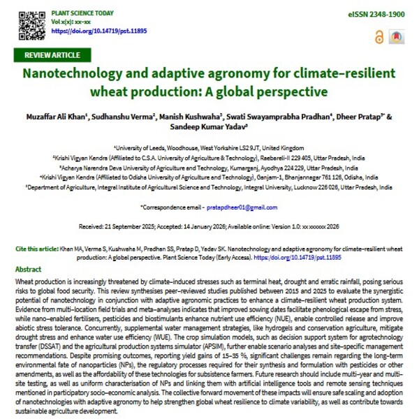 Wheat production is increasingly threatened by climate–induced stresses such as terminal heat, drought and erratic rainfall, posing serious risks to global food security. This review synthesises peer–reviewed studies published between 2015 and 2025 to evaluate the synergistic potential of nanotechnology in conjunction with adaptive agronomic practices to enhance a climate–resilient wheat production system. Evidence from multi–location field trials and meta–analyses indicates that improved sowing dates facilitate phenological escape from stress, while nano–enabled fertilisers, pesticides and biostimulants enhance nutrient use efficiency (NUE), enable controlled release and improve abiotic stress tolerance. Concurrently, supplemental water management strategies, like hydrogels and conservation agriculture, mitigate drought stress and enhance water use efficiency (WUE). The crop simulation models, such as decision support system for agrotechnology transfer (DSSAT) and the agricultural production systems simulator (APSIM), further enable scenario analyses and site–specific management