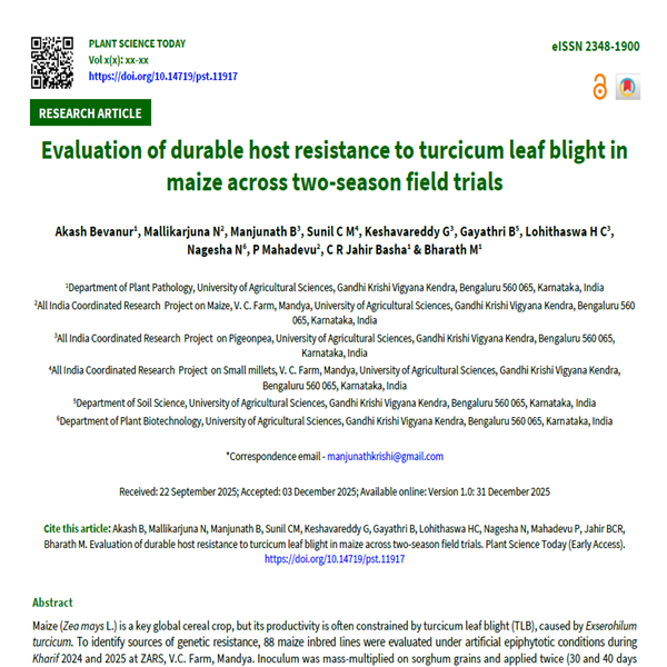 Maize (Zea mays L.) is a key global cereal crop, but its productivity is often constrained by turcicum leaf blight (TLB), caused by Exserohilum turcicum. To identify sources of genetic resistance, 88 maize inbred lines were evaluated under artificial epiphytotic conditions during Kharif 2024 and 2025 at ZARS, V.C. Farm, Mandya. Inoculum was mass-multiplied on sorghum grains and applied twice (30 and 40 days after sowing), followed by a light water spray to ensure effective infection. Disease severity was recorded using a 1-9 modified disease rating scale and inbred lines were categorised based on per cent disease index (PDI), lesion length and days to symptom appearance. Nine inbreds (CML 11, CML 34, CML 50, CML 59, CML 93, CML 94, CML 173, CML 191 and the resistant check SKV-50) consistently exhibited resistant reactions, showing low PDI (2.94-27.05 %) and delayed symptom onset (12-17.5 days). Sixty-two inbreds were moderately resistant (PDI 31-50 %), while sixteen were moderately susceptible (PDI 51-70 %). In contrast, CML 166, CML 176 and the susceptible check CM-202 were highly susceptible, exhibiting PDI ≥ 70 %, rapid symptom appearance (4.5-6 days) and extensive lesion expansion (>30 cm²). Although season-to-season variations in disease pressure were recorded, inbred rankings remained stable. The resistant lines identified provide valuable genetic resources for breeding stable TLB resistance, while the susceptible lines offer reliable checks for understanding host-pathogen interactions.