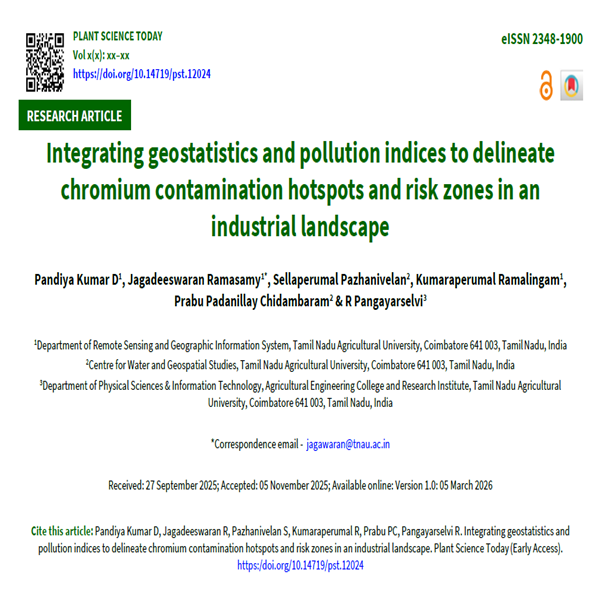 Chromium (Cr) contamination in soils poses a major ecological and human health concern in industrial landscapes, particularly in tannery clusters. In this study, geostatistical methods and pollution indices were integrated to delineate Cr contamination hotspots and ecological risk zones in the Walaja block, Tamil Nadu, India. Sixty-eight surface soil samples were collected in September, 2024 and analysed for physicochemical properties and total Cr concentrations using standard protocols. The contamination factor (CF), geo-accumulation index (Igeo) and ecological risk index (Er) were computed. Spatial interpolation was performed using inverse distance weighting (IDW) and hotspots were identified with the Getis–Ord Gi* statistic. Soil Cr concentrations ranged from 129 to 2625 mg/kg (mean ≈ 601 mg/kg), which is over 27 times the natural background level. Contamination factor (CF) and Igeo values indicated severe to extreme contamination in the northwestern industrial corridor, whereas Er values were mostly in the low-to-moderate risk category due to Cr’s relatively low toxicity factor. Spatial analysis confirmed statistically significant Cr hotspots in tannery zones and cold spots in agricultural areas. Integrated risk zonation