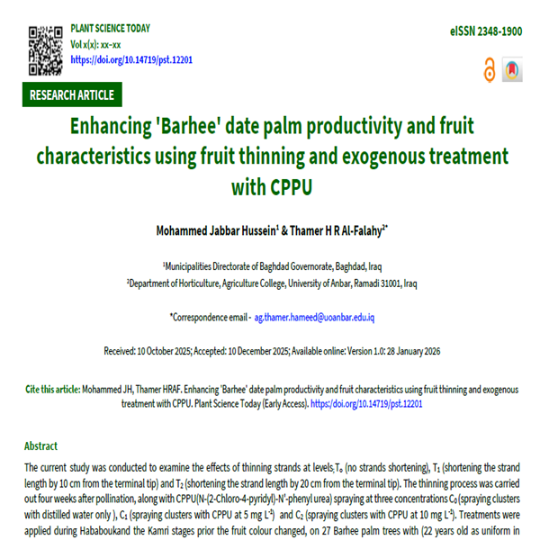 The current study was conducted to examine the effects of thinning strands at levels; To (no strands shortening), T1 (shortening the strand length by 10 cm from the terminal tip) and T2 (shortening the strand length by 20 cm from the terminal tip). The thinning process was carried out four weeks after pollination, along with CPPU(N-(2-Chloro-4-pyridyl)-N'-phenyl urea) spraying at three concentrations C0 (spraying clusters with distilled water only ), C1 (spraying clusters with CPPU at 5 mg L-1) and C2 (spraying clusters with CPPU at 10 mg L-1). Treatments were applied during Hababoukand the Kamri stages prior the fruit colour changed, on 27 Barhee palm trees with (22 years old as uniform in vegetative growth as possible) during the 2023-2024 season in a private grove located in Al-Tarmia province, 55 km north of Baghdad. The results showed that thinning process especially by T2 improved fruit quality, reduced fruits drop, increased bunch weight and yield per palm, accelerated fruit ripening, increased the (TSS), decreased acidity and enhanced the ripening index compared to control, Conversely spraying with CPPU, especially C2 improved fruit qualities, minimizing fruit drop, increased the weight of the bunch, yield per palm, reduced fruit ripening, TSS, increased acidity consequently decreased ripening index. The combined treatment T2C2 produced the most significant improvement in productivity and fruit characteristics.