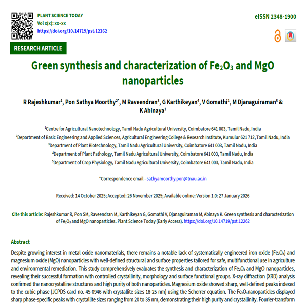predominantly hexagonal MgO nanoparticles sized 20-40 nm with sharp boundaries indicating low defects, while Fe2O3 nanoparticles exhibited near-spherical to polyhedral morphologies ranging from 23 to 64 nm, with moderate agglomeration attributed to magnetic interactions. These well-controlled nanostructures, with high surface area and reactivity, are promising candidates for agricultural and environmental applications, nanofertilizers, plant virus management, catalysis and remediation.