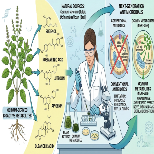 Antimicrobial resistance (AMR) is rapidly growing worldwide and becoming a well-being threat. It challenges the consumption of antibiotics and eventually jeopardises the management of diseases. Excessive use of antibiotics led to the development of pathogens that are resistant towards multiple drugs. Ocimum species (Tulsi) is known for their potent antimicrobial efficacy and for traditional pharmaceutical applications. It also holds a revered status in Ayurveda and was used to treat various diseases like respiratory, digestive issues, skin infections and stress-related disorders due to its rich phytochemical content that includes ursolic acid, flavonoids, eugenol, rosmarinic acid and essential oils. These bioactive compounds exhibit antimicrobial efficacy against pathogenic microbes. Mechanistically, its metabolites disrupt the microbial cell membranes, inhibit quorum sensing (QS), suppress the production of critical enzymes like β-lactamases, inhibit the formation of biofilm, thus making pathogens more susceptible to antibiotics. Notably, eugenol has been demonstrated to be effective against methicillin-resistant Staphylococcus aureus (MRSA), whereas linalool and thymol show efficacy against extended-spectrum β-lactamase (ESBL)-producing Escherichia coli. The main objective of this study is to seek and elucidate the possible mechanism of action and potential of Ocimum as sustainable next-generation antimicrobial agents, where Ocimum-based treatments represents "One Health" approach that could provide safe and natural ways to fight against AMR in humans and animals.