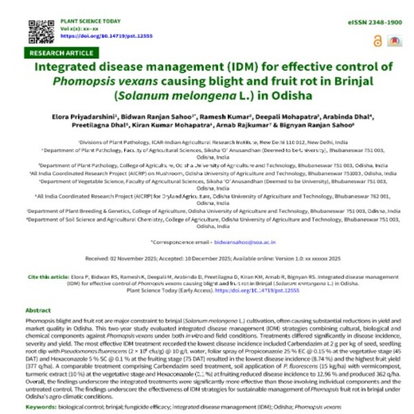 Phomopsis blight and fruit rot are major constraint to brinjal (Solanum melongena L.) cultivation, often causing substantial reductions in yield and market quality in Odisha. This two-year study evaluated integrated disease management (IDM) strategies combining cultural, biological and chemical components against Phomopsis vexans under both in vitro and field conditions. Treatments differed significantly in disease incidence, severity and yield. The most effective IDM treatment recorded the lowest disease incidence included Carbendazim at 2 g per kg of seed, seedling root dip with Pseudomonas fluorescens (2 × 10⁸ cfu/g) @ 10 g/L water, foliar spray of Propiconazole 25 % EC @ 0.15 % at the vegetative stage (45 DAT) and Hexaconazole 5 % SC @ 0.1 % at the fruiting stage (75 DAT) resulted in the lowest disease incidence (8.74 %) and the highest fruit yield (377 q/ha). A comparable treatment comprising Carbendazim seed treatment, soil application of P. fluorescens (15 kg/ha) with vermicompost, turmeric extract (10 %) at the vegetative stage and Hexaconazole (0.1 %) at fruiting reduced disease incidence to 12.96 % and produced 362 q/ha. Overall, the findings underscore the integrated treatments were significantly more effective than those involving individual components and the untreated control. The findings underscore the effectiveness of IDM strategies for sustainable management of Phomopsis fruit rot in brinjal under Odisha’s agro-climatic conditions.