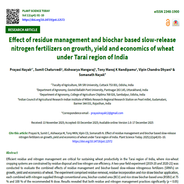 Efficient residue and nitrogen management are critical for sustaining wheat productivity in the Tarai region of India, where rice-wheat cropping systems are constrained by residue disposal and low nitrogen use efficiency. A two-year field experiment (2019-20 and 2020-21) was conducted to evaluate the combined effects of residue management and biochar-based slow-release nitrogenous fertilizers (SRNFs) on growth, yield and economics of wheat. The experiment comprised residue removal, residue incorporation and rice straw biochar application, each combined with nitrogen supplied through conventional urea, biochar-coated urea (BCU) and rice straw biochar-based urea (RSBU) at 75 % and 100 % of the recommended N dose. Results revealed that both residue and nitrogen management practices significantly (p < 0.05) affected growth and productivity of wheat. Biochar incorporation enhanced plant height, tiller density and dry matter accumulation compared to residue removal. Among nitrogen treatments, 100 % recommended N rate applied via SRNFs (BCU and RSBU) produced 7-11 % higher dry matter and 6-9 % greater grain yield than conventional urea, while 75 % N through SRNFs achieved yields comparable to N applied via 100 % urea, indicating improved nitrogen use efficiency. Enhanced SPAD, NDVI and Fv/Fm values under SRNFs reflected greater chlorophyll content and sustained photosynthetic activity. Economically, the highest net return and benefit-cost ratio were obtained from the combination of biochar incorporation with 100 % N applied through RSBU, followed by 100 % N via BCU. Despite slightly higher production costs, biochar-based fertilizers substantially improved profitability. Overall, integrating rice straw biochar with biochar-based slow-release urea offers a sustainable and resource-efficient strategy for enhancing wheat productivity and profitability under the Tarai agro-ecological conditions.