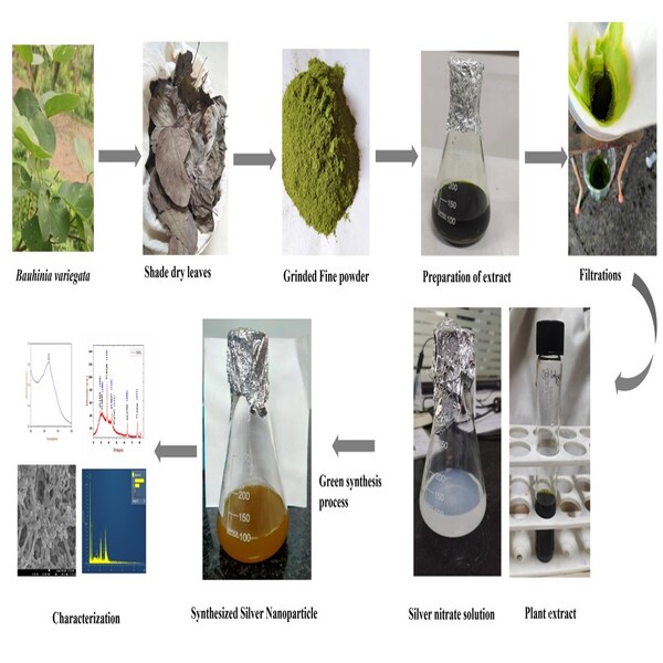 The synthesis of silver nanoparticles (Ag-NPs) gained significant attention due to their unique physicochemical properties and various applications in biological, environmental and technological disciplines. The biosynthesis of noble metal nanoparticles is a fast-growing research field that is drawing interest from many different scientific areas. In the present study, Bauhinia variegata methanol leaf extract was used as a reducing agent and stabiliser during the synthesis of Ag-NPs. The methanol extract of B. variegata leaves was analysed by gas chromatography-mass spectrometry (GC-MS). The synthesised silver nanoparticles were characterised by UV-visible spectroscopy, Fourier transform infrared (FTIR), scanning electron microscopy (SEM) and X-ray diffraction techniques. Nanoparticles were characterised using UV-visible spectroscopy and a distinctive absorbance peak at 433 nm was revealed. The zeta potential examination of the produced nanoparticles showed an average zeta potential value of -20.2 mV. The average shape of silver nanoparticles is indicated by SEM (Hitachi S-4500) examination with a diameter of 20–40 nm. The average crystalline size was ~29 nm. This study evaluates green synthesis and traditional methods, highlighting their respective benefits and drawbacks, while also clarifying the essential mechanisms underlying the synthesis of Ag-NPs. The findings suggest that green-synthesised Ag-NPs possess significant potential in medicine and environmental applications.