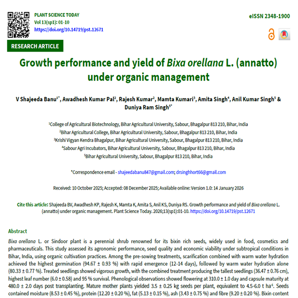 Bixa orellana L. or Sindoor plant is a perennial shrub renowned for its bixin rich seeds, widely used in food, cosmetics and pharmaceuticals. This study assessed its agronomic performance, seed quality and economic viability under subtropical conditions in Bihar, India, using organic cultivation practices. Among the pre-sowing treatments, scarification combined with warm water hydration achieved the highest germination (94.67 ± 0.93 %) with rapid emergence (12-14 days), followed by warm water hydration alone (80.33 ± 0.77 %). Treated seedlings showed vigorous growth, with the combined treatment producing the tallest seedlings (36.47 ± 0.76 cm), highest leaf number (6.0 ± 0.58) and 95 % survival. Phenological observations showed flowering at 310.0 ± 1.0 day and capsule maturity at 480.0 ± 2.0 days post transplanting. Mature mother plants yielded 3.5 ± 0.25 kg seeds per plant, equivalent to 4.5-6.0 t ha-1. Seeds contained moisture (8.53 ± 0.45 %), protein (12.20 ± 0.20 %), fat (5.13 ± 0.15 %), ash (3.43 ± 0.75 %) and fibre (9.20 ± 0.20 %). Bixin content averaged 3.63 ± 0.58 %, translating to 162-216 kg ha-1 pigment yield. Economic analysis indicated gross returns of Rs. 36-54 lakh ha-1 year-1 with a cost benefit ratio of 45:1- 67.5:1. The present study confirm that B. orellana L. performs reliably under subtropical agroecosystems, producing high seed and pigment yield with substantial profitability. The crop demonstrates strong potential as a sustainable, perennial cash crop for natural pigment industries and as a promising diversification option for farmers in organic production management.