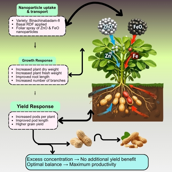 Groundnut (Arachis hypogaea L.) is an important legume crop cultivated for its oil and protein content and widely used for human consumption and animal feed. However, its productivity is often limited by micronutrient deficiencies, particularly zinc (Zn) and iron (Fe), especially in calcareous soils. This investigation was conducted to determine the effect of foliar application of zinc and iron nanoparticles on the growth and yield of groundnut to identify the optimal concentration under field conditions. A field experiment was conducted at the Bangladesh Institute of Nuclear Agriculture (BINA), Sub-station Sunamganj, following a randomised complete block design (RCBD) with 17 treatments and 3 replications. The treatments consisted of different concentrations and combinations of Zn and Fe nanoparticles applied as foliar sprays. Growth parameters and yield attributes were recorded and analysed statistically. The results showed that foliar application of Zn and Fe nanoparticles significantly influenced growth and yield parameters. The combined treatment Zn100 + Fe50 mg L-1 (T8) produced the highest biomass accumulation, pod number and grain yield compared to other treatments. Higher concentrations did not result in further yield improvement, indicating a concentration-dependent response. These findings suggest that moderate combined application of Zn and Fe nanoparticles may enhance growth and yield performance of groundnut under the tested conditions. Further studies incorporating detailed soil and nanoparticle characterisation are recommended to strengthen mechanistic understanding.