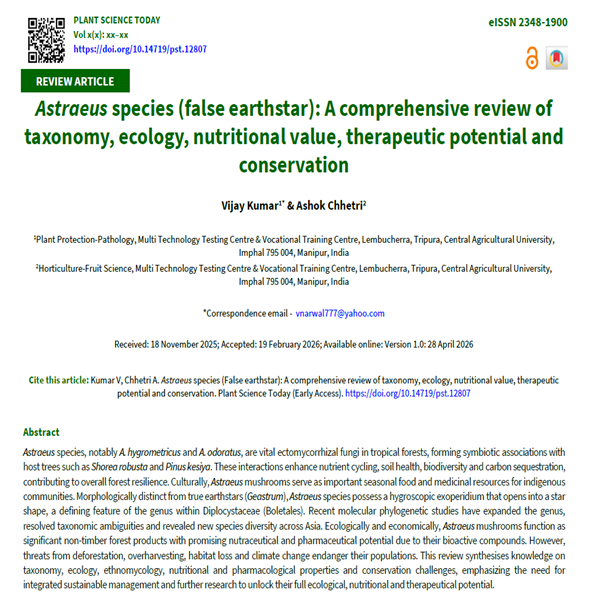 - 8. Vishal V, Thongsuwan P, Thamvithayakorn P, Suwannasai N, Phosri C, Martín MP, et al. Comprehensive morphological and phylogenetic inferences of star-shaped fungus Astraeus (Diplocystidiaceae) from sal-dominant tropical and subtropical Pinus- Shorea forests in India: An integrative taxonomic analysis. Plant Fungal Syst. 2024;69(1):39– 52. https://doi.org/10.35535/pfsyst-2024-0005