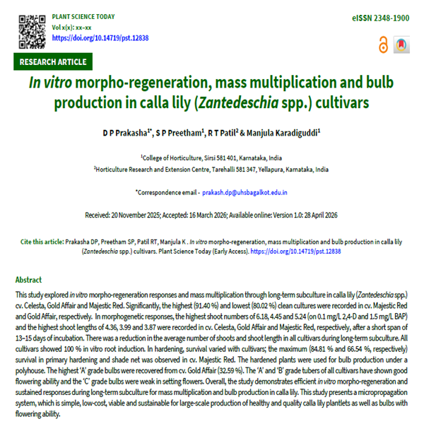 In vitro morpho-regeneration, mass multiplication and bulb production in calla lily (Zantedeschia spp.) cultivars