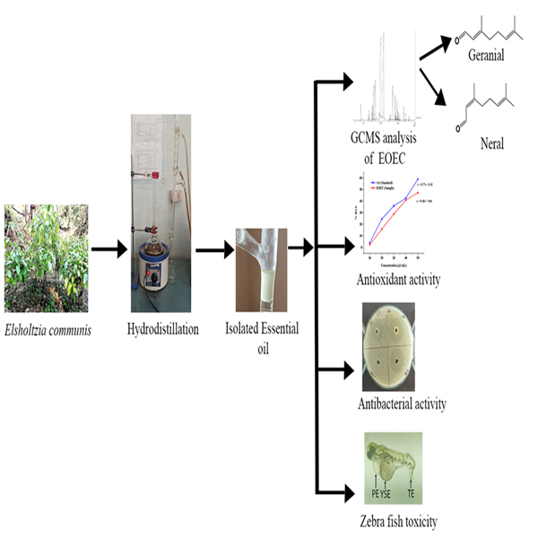 Elsholtzia communis (Collett & Hemsl.) Diels is traditionally used in herbal medicine, yet the phytochemical composition and developmental safety of its flower-derived essential oil remain insufficiently explored. This study aimed to characterise the essential oil of E. communis flowers (EOEC), evaluate its antioxidant and antibacterial activities and assess its developmental toxicity using zebrafish (Danio rerio) embryos. The EOEC was extracted by hydro-distillation and characterised using gas chromatography-mass spectrometry (GC-MS) and attenuated total reflectance-Fourier transform infrared (ATR-FTIR) spectroscopy. Antioxidant potential was evaluated through DPPH and ABTS radical scavenging assays, while antibacterial activity against selected Gram-positive and Gram-negative bacteria was determined using agar well diffusion and minimum inhibitory concentration (MIC) assays. Developmental toxicity was assessed in zebrafish embryos by monitoring mortality and morphological abnormalities to calculate LC₅₀ values. The GC-MS analysis revealed citral-A (geranial, 45.5 %) and citral-B (neral, 37.8 %) as the major constituents of EOEC, while FTIR spectra confirmed the presence of characteristic OH, C=O and CH functional groups. EOEC exhibited moderate antioxidant activity with EC₅₀ values of 45.12 µg/mL (DPPH) and 43.15 µg/mL (ABTS) and demonstrated significant antibacterial effects against both Gram-positive and Gram-negative strains. Zebrafish embryo assays showed clear dose-dependent lethality and developmental abnormalities, with LC₅₀ values of 123 µg/mL for EOEC and 145 µg/mL for citral. Notably, adverse developmental effects occurred at concentrations close to those producing biological activity. In conclusion, EOEC possesses promising antioxidant and antibacterial properties but exhibits concentration-dependent embryotoxicity, emphasising the need for careful dose optimisation and biosafety evaluation prior to therapeutic or nutraceutical applications.