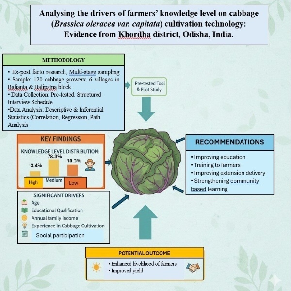 This study was conducted to assess the extent of knowledge possessed by cabbage farmers on cabbage cultivation technology in Khordha district of Odisha and to identify the socio-economic factors driving their knowledge level. An ex-post facto research design was employed, with a sample of 120 cabbage growers selected randomly. Multi-stage sampling was utilised to select respondents from 6 purposively chosen villages in Balianta and Balipatna blocks of Khordha. A pre-tested, structured interview schedule was used to gather the data, which were further analysed using descriptive and inferential statistics such as correlation, multiple linear regression, step-wise multiple regression and path analysis. The results showed that 78.3 % of the respondents had a medium level of knowledge, while 18.3 % and 3.4 % of them had low and high levels of knowledge on cabbage cultivation technology respectively. Significant contributors to the knowledge level of cabbage farmers included age, educational qualification, annual family income, experience in cabbage cultivation, social participation and innovativeness. The findings thus indicate that certain targeted measures like improving educational facilities, imparting training to farmers, improving extension advisory services and strengthening community-based learning approaches could bridge the knowledge gap among the farmers, thereby ensuring sustainable yield of cabbage and improved livelihood in the region.