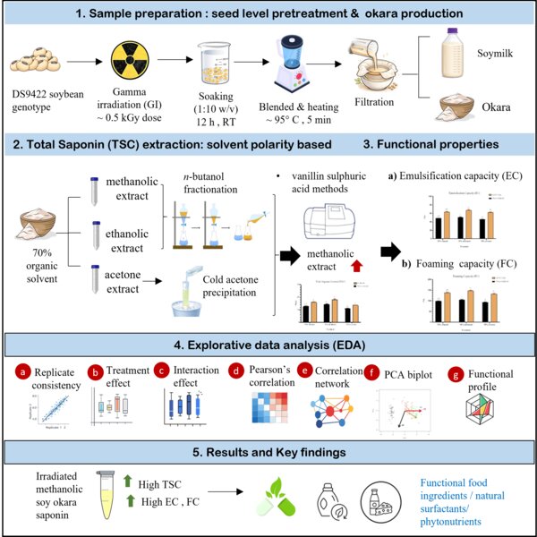 Soy saponins are amphiphilic triterpenoid glycosides valued for their surface activity and wide-ranging functionality and bioactivity. Okara, a by-product of soymilk production, is a potential source of saponins, but its recovery is limited by strong interactions with the insoluble matrix. This study investigated the effects of gamma irradiation (GI- 0.5 kGy) applied as a seed-level pretreatment, combined with 70 % aqueous organic solvent (methanol, ethanol and acetone) extraction of varying polarity on total saponin recovery from okara. The purified extracts were then analysed for total saponin content (TSC) and evaluated for emulsifying capacity (EC) and foaming capacity (FC) as indicators of surface-active functionality. The results showed that irradiation significantly increased total saponin recovery across all solvent, with the highest increase observed with methanol (18.17 mg/g DW), representing a ~27 % rise compared with the corresponding non-irradiated control. Irradiated extracts also exhibit enhanced emulsifying (1.31–1.35-fold) and foaming capacities (1.39–1.42-fold). Multivariate analysis revealed strong positive correlations between saponin content and functional properties and clearly distinguished irradiated from non-irradiated samples, with methanol showing the strongest combined effect with irradiation. To the best of our knowledge, this study provides the first evidence that GI combined with polarity-optimised solvent extraction substantially enhances saponin yield and surface-active functionality in okara. Overall, these findings highlight okara as a value-added sustainable source of saponins with potential applications as natural surfactants and phytonutrients in food-related applications.