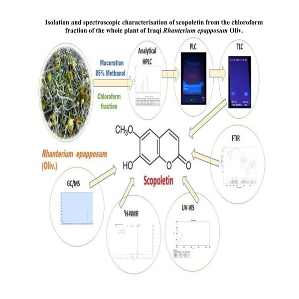 Rhanterium epapposum Oliv. is a desert plant from the family Asteraceae, widely distributed in Iraq and traditionally utilised for treating skin infections and gastrointestinal disorders, as well as for its insecticidal properties. However, its phytochemical composition, particularly with respect to coumarin constituents, remains insufficiently explored. The present study aimed to isolate and identify a major coumarin compound from the whole plant of Iraqi R. epapposum. The coarse powdered plant material was defatted with n-hexane, extracted by cold maceration with 85 % aqueous methanol and subjected to successive solvent fractionation. The chloroform fraction was selected for further purification based on its phytochemical profile. Thin-layer chromatography revealed a prominent fluorescent spot indicative of a coumarin compound and high-performance liquid chromatography confirmed its presence. The compound was isolated using preparative layer chromatography and obtained as a single major constituent (coded DA10) with a yield of 0.013 %. Structural identification was achieved through combined chromatographic and spectroscopic analyses, including ultraviolet–visible (UV–Vis) spectroscopy, high-performance liquid chromatography (HPLC) spiking, Fourier transform infrared (FTIR) spectroscopy, proton nuclear magnetic resonance (¹H-NMR) spectroscopy and gas chromatography-mass spectrometry (GC-MS), which showed excellent agreement with an authenticated scopoletin standard. The isolated compound DA10 was identified as scopoletin. This study provides the first confirmed isolation and comprehensive characterisation of scopoletin from R. epapposum collected in Iraq. These findings contribute to the phytochemical profiling of the Iraqi chemotype of the species and provide a scientific basis for future investigations on the biological activities and pharmacological potential of the isolated coumarin and other fractions of the plant.