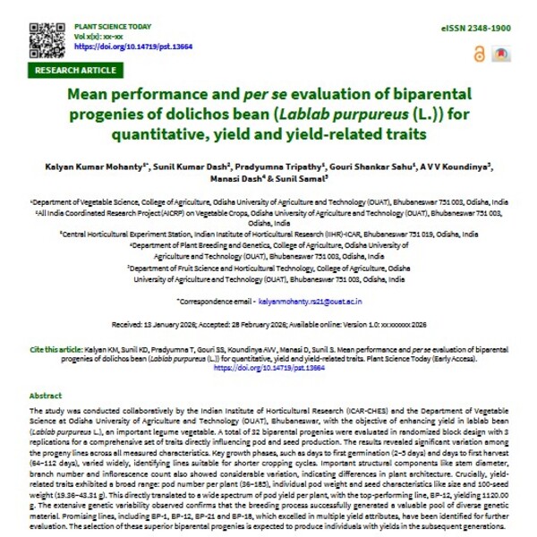 The study was conducted collaboratively by the Indian Institute of Horticultural Research (ICAR-CHES) and the Department of Vegetable Science at Odisha University of Agriculture and Technology (OUAT), Bhubaneswar, with the objective of enhancing yield in lablab bean (Lablab purpureus L.), an important legume vegetable. A total of 32 biparental progenies were evaluated in randomized block design with 3 replications for a comprehensive set of traits directly influencing pod and seed production. The results revealed significant variation among the progeny lines across all measured characteristics. Key growth phases, such as days to first germination (2–5 days) and days to first harvest (64–112 days), varied widely, identifying lines suitable for shorter cropping cycles. Important structural components like stem diameter, branch number and inflorescence count also showed considerable variation, indicating differences in plant architecture. Crucially, yield-related traits exhibited a broad range: pod number per plant (36–185), individual pod weight and seed characteristics like size and 100-seed weight (19.36–43.31 g). This directly translated to a wide spectrum of pod yield per plant, with the top-performing line, BP-12, yielding 1120.00 g. The extensive genetic variability observed confirms that the breeding process successfully generated a valuable pool of diverse genetic material. Promising lines, including BP-1, BP-12, BP-21 and BP-18, which excelled in multiple yield attributes, have been identified for further evaluation. The selection of these superior biparental progenies is expected to produce individuals with yields in the subsequent generations.
