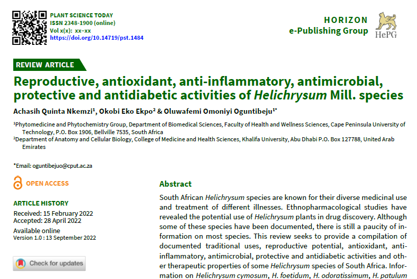 - Akinyede KA, Cupido CN, Hughes GD, Oguntibeju OO, Ekpo OE. Medicinal properties and in vitro biological activities of selected Helichrysum species from South Africa: A Review. Plants. 2021 Aug;10(8):1566. https://doi.org/10.3390/plants10081566