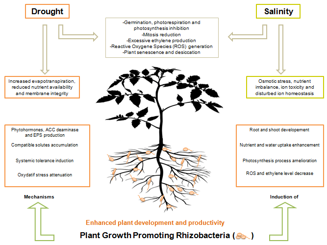 Abiotic stresses are major constraints for plant growth, crop yield and global food security. Plant physiological, biochemical and molecular processes are highly affected under unfavorable environmental conditions, resulting in substantial losses to crop productivity and requiring an immediate response. Abiotic stress resistant plant growth-promoting rhizobacteria (PGPR) are a profitable and sustainable solution because of their efficiency in plant growth regulation, crop yield improvement and abiotic stress alleviation. They help plants to cope with growth inhibitory effects of abiotic stresses through several mechanisms, mainly phytohormones and osmolyte production, improvement of nutrient acquisition, enhancement of antioxidant system. Plant-PGPR interactions are vital for sustainable agriculture and industrial purposes, because they are based on biological processes and replace conventional agricultural practices. PGPR may play a key role as an ecological engineer to solve environmental stress problems. The use of microbes is a feasible and potential technology to help meeting the future global food needs with reduced impact on soil and environmental quality. Present review deals about the abiotic stresses (drought and salinity) affecting plant growth and highlights the impact of PGPR on restoration of plant growth under the stressful conditions with the goal of developing an eco-friendly and cost-effective strategy for agricultural sustainability.
