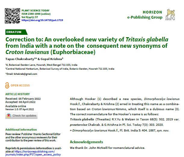 Chakrabarty T, Krishna G. Correction to: An overlooked new variety of Tritaxis glabella from India with a note on the consequent new synonyms of Croton lawianus (Euphorbiaceae). Plant Sci. Today [Internet]. 2022 Apr. 6 [cited 2025 Nov. 26];9(sp1):37. Available from: https://www.horizonepublishing.com/journals/index.php/PST/article/view/1719