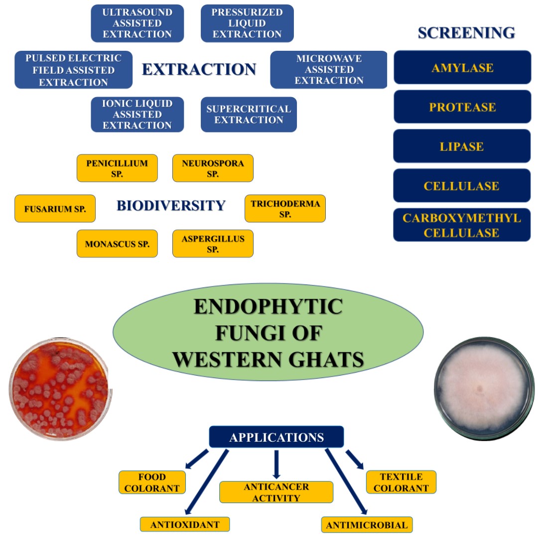 Concerns about the negative impacts of synthetic colorants on both consumers and the environment have sparked a surge of interest in natural colorants. This has boosted the global demand for natural colorants in the food, cosmetics and textile industries. Pigments and colorants derived from plants and microorganisms are currently the principal sources used by modern industry. When compared to the hazardous effects of synthetic dyes on human health, natural colors are quickly degradable and have no negative consequences. In fact, fungal pigments have multidimensional bioactivity spectra too. Western Ghats, a biodiversity hotspot has a lot of unique ecological niches known to harbor potential endophytic pigment-producing fungi having enumerable industrial and medical applications. Most of the fungi have coevolved with the plants in a geographical niche and hence the endophytic associations can be thought to bring about many mutually beneficial traits. The current review aims to highlight the potential of fungal pigments found in the Western ghats of India depicting various methods of isolation and screening, pigment extraction and uses. There is an urgent need for bioprospecting for the identification and characterization of extremophilic endophytic fungi to meet industry demands and attain sustainability and balance in nature, especially from geographic hotspots like the Western Ghats.