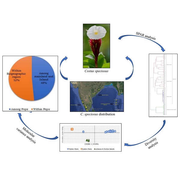 Costus speciosus (Koen ex. Retz.) Sm. is a major source of diosgenin, used for the commercial synthesis of cortisone, sex hormones and contraceptives. The genetic diversity analysis in wild populations of C. speciosus from 3 biogeographic regions viz., Western Ghats (WG), Eastern Ghats (EG) and Andaman and Nicobar Islands (AN) were done using 2 different Single Primer Amplification Reaction (SPAR) methods. A total of 70 accessions spanning these regions were used in the present study. The assay yielded a total of 314 amplicons of which 268 were polymorphic, exhibiting 85.35% of polymorphism. The prevalence of high rate of genetic differentiation (mean Gst = 0.90) and low gene flow (mean Nm= 0.06) are the main attributes of the observed low diversity in these populations. The accessions clustered broadly under 2 major groups corresponding to the three biogeographic zones with insular populations diverse from the mainland. This was further resolved by AMOVA analysis. C. speciosus is found to exist in different cytotypes exhibiting allopolyploidy. The differences in distribution and genetic fitness of the population from EG and WG may be attributed to the allopolyploid nature of the taxa. In the present study, Island populations comprise very low heterozygosity (Ht = 0.10) suggesting that the rate of fixation is more in these populations. Similarly, the rate of gene flow was almost absent (Nm = 0.02). The higher levels of genetic similarity (0.99) may be due to an increase in fixation of the genes resulting from allopolyploidy. This is the first study on comparative genetic diversity of C. speciosus using SPAR markers.