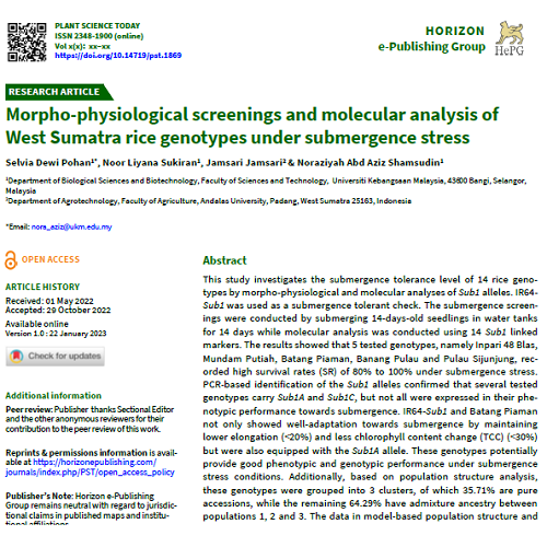 This study investigates the submergence tolerance level of 14 rice genotypes by morpho-physiological and molecular analyses of Sub1 alleles. IR64-Sub1 was used as a submergence tolerant check. The submergence screenings were conducted by submerging 14-days-old seedlings in water tanks for 14 days while molecular analysis was conducted using 14 Sub1 linked markers. The results showed that 5 tested genotypes, namely Inpari 48 Blas, Mundam Putiah, Batang Piaman, Banang Pulau and Pulau Sijunjung, recorded high survival rates (SR) of 80% to 100% under submergence stress. PCR-based identification of the Sub1 alleles confirmed that several tested genotypes carry Sub1A and Sub1C, but not all were expressed in their phenotypic performance towards submergence. IR64-Sub1 and Batang Piaman not only showed well-adaptation towards submergence by maintaining lower elongation (<20%) and less chlorophyll content change (TCC) (<30%) but were also equipped with the Sub1A allele. These genotypes potentially provide good phenotypic and genotypic performance under submergence stress conditions. Additionally, based on population structure analysis, these genotypes were grouped into 3 clusters, of which 35.71% are pure accessions, while the remaining 64.29% have admixture ancestry between populations 1, 2 and 3. The data in model-based population structure and UPGMA dendrogram supported that rice genotypes in this study have 3 well-differentiated genetic populations and admixtures. Most genotypes have a close genetic relationship with Nei’s similarity index ranging from 0.571 to 0.893.