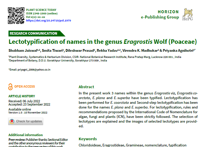 7. Vivek CP, Murthy GVS, Nair VJ. The Genus Eragrostis (Poaceae: Chloridoideae) in India: Taxonomic Revision. Nelumbo. 2021;63(1):33-101. Available at: http://nelumbo-bsi.org/index.php/nlmbo/article/view/165149 https://doi.org/10.20324/nelumbo/v63/2021/165149