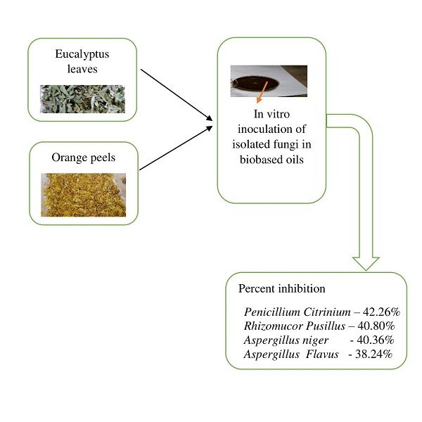 Biobased oils found in the leaves of many plants used as coating materials for the preservation of fruits influence the handling of citrus fruits. The effectiveness of these oils on the target organisms is associated with the ability to develop resistant strains. In the present study the antifungal activity of the biobased oils obtained from orange peel and eucalyptus leaves against Aspergillus niger, Aspergillus flavus, Rhizomucor pusillus and Penicillium citrinium was tested at various concentrations in vitro. Sample fruits showing signs of decay during postharvest storage were selected for isolation and identification of the fungi. A serial dilution method was applied at 10 fold for fungi isolates and concentrations were plated onto Potato Dextrose Agar (PDA) media 15 mL. The plates were incubated at room temperature (28 °C) and observed every 24 hrs for possible microbial growth. The pour plate method was used to investigate the antifungal activity of the oils on the test fungi in vitro. The results indicate a continuous decline in the inhibition of the biobased oil treatment during the period of inoculation. The interaction effect of the different biobased oil, their concentrations and the different isolates was significant (P ? 0.05) from day 1 to day 7 during the inoculation. The combined orange peels and eucalyptus leaves at 100% concentration recorded (69.35%) as the highest percent of inhibition which was significantly higher than all other interactions. The least percent inhibition was found with orange peels biobased oil at 1:1 v/v concentration against Aspergillus flavus (24.23 %). Biobased oils at full strength from eucalyptus combined with oil from orange peels demonstrated significant potential against Penicillium citrinium. This research revealed the potential antifungal properties in vitro of the biobased oils against pathogenic fungi. These findings provide the basis for the application of combined biobased oil as an effective antifungal remedy against pathogenic fungi.