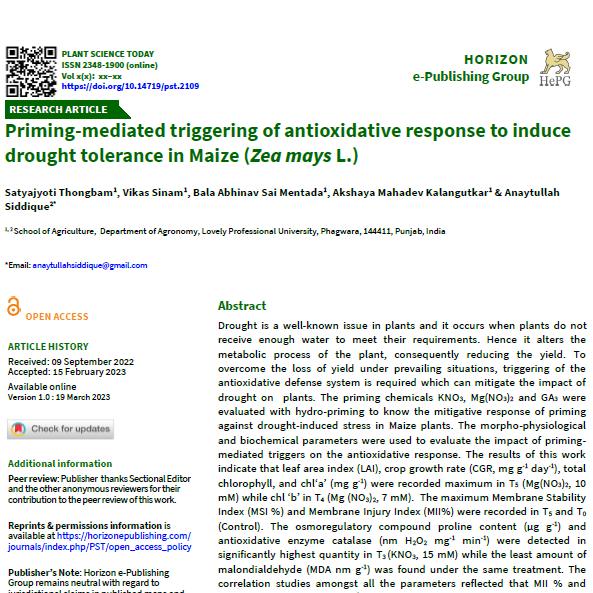 Priming-mediated triggering of antioxidative response to induce drought tolerance in Maize (Zea mays L.)