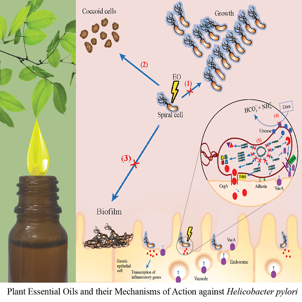 Essential oils (EOs) obtained from different medicinal and aromatic plant families by steam distillation have been used in the pharmaceutical, food, and fragrance industries. The plant EOs and their broad diversity of chemical components have attracted researchers worldwide due to their human health benefits and antibacterial properties, especially their treatment of Helicobacter pylori infection. Since H. pylori has been known to be responsible for various gastric and duodenal diseases such as atrophic gastritis, peptic ulcer, gastric adenocarcinoma, and mucosa-associated lymphoid tissue lymphoma, several combination antibiotic therapies have been increasingly used to enhance the eradication rate of the bacterial infection. However, in the last decades, the efficacy of the therapies has decreased significantly due to widespread emergence of multidrug resistant strains of H. pylori. In addition, side-effects from commonly used antibiotics and recurrence of the bacterial infection have drawn public health concern globally.