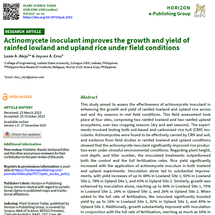 Actinomycete inoculant improves the growth and yield of rainfed lowland and upland rice under field conditions