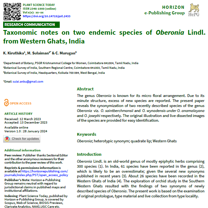 3. Geiger DL, Sulaiman M, Murugan C. Studies in Oberonia 10. A re-evaluation of Oberonia brachystachys and O. subligaculifera (Orchidaceae: Malaxideae) and their synonyms. Rheedea. 2021; 31(3): 141–160.