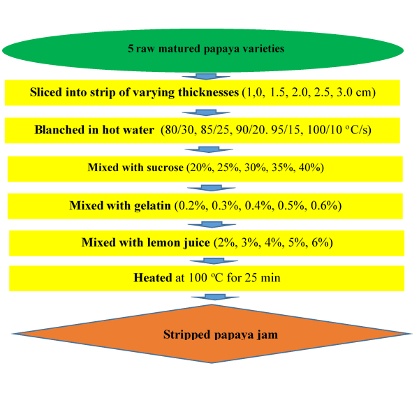 In the post-harvest stage, papaya fruit is highly perishable due to its climacteric characteristic and high respiration rate. Papayas are typically consumed fresh, but converting them into jam as a value-added foodstuff could help minimize losses. The purpose of this research was to evaluate various papaya fruit varieties (namely Va505, Vo786, Sapna, Mangnum, Tn55) and key technical variables such as blanching temperature/time, thickness of papaya strip, gelatin ratio, sucrose ratio and lemon juice ratio concerning the color, texture and overall acceptability of papaya jam. Raw matured papaya fruits at technical maturity were selected for the experiments. Papaya strips were blanched in hot water at different temperature and time (80 °C for 30 min, 85 °C for 25 min, 90 °C for 20 min, 95 °C for 15 min and 100 °C for 10 min). These blanched papaya strips were then mixed with varying concentration of sucrose (20, 25, 30, 35, 40%), gelatin (0.2, 0.3, 0.4, 0.5, 0.6%) and lemon juice (2, 3, 4, 5, 6%). The samples were kept at 8 oC for 30 min before heating at 100 oC for 25 min. The results showed that the Sapna variety had the highest contents of beta-carotene (8.72±0.01 µg/g) and ascorbic acid (68.17±0.14 g/100 g), while the Vo786 variety had the lowest contents of beta-carotene (4.17±0.02 µg/g) and ascorbic acid (64.49±0.09 g/100 g). For the preparation of papaya jam, the papaya fruit should be peeled and sliced into strips with a thickness of 2.0 mm. These strips should be blanched primarily at 95 °C for 15 min, then mixed with 30% sucrose, 0.5% gelatin and 5% lemon juice. The mixture should be allowed to stand at 8 °C for 30 min before being heated at 100 °C for 25 min. The stripped papaya jam should then be cooled, packed in plastic bags and stored at ambient temperature for 6 months. This study successfully identified Sapna as the appropriate papaya fruit variety and verified several major parameters for jam making. The formulated Papaya jam is designed to maintain its quality for long shelf-life storage