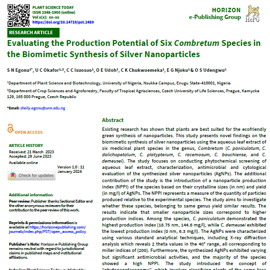Existing research has shown that plants are best suited for the ecofriendly green synthesis of nanoparticles. This study reported novel findings on the biomimetic synthesis of silver nanoparticles using the aqueous leaf extract of six medicinal plant species in the genus, Combretum (C. paniculatum, C. dolichopetalum, C. platypterum, C racemosum, C. bauchiense, and C. demeusei). It was concerned with the characterization, phytochemical screening, antimicrobial and cytological evaluation of the synthesized silver nanoparticles (AgNPs). The novelty of this study lies in the creation of a nanoparticle production index (NPPI) of the species based on their crystalline sizes (in nm) and yield (in mg/l) of AgNPs. This NPPI can be defined as a measure of the quantity of particles produced with respect to the experimental species.  The study also investigated whether these species would produce similar results since they belong to the same genus. It was observed that the smaller the size of the nanoparticles, the higher the production index. The highest production index was observed in C. paniculatum (18.75 nm, 144. 6 mg/l), and the least in C. demeusei (0 nm, 6.3 mg/l). The AgNPs were characterized using various standard analytical techniques. The X-ray diffraction analysis indicated that the species showed 2 theta values in the 40° range, all corresponding to miller indices of (200). The synthesized AgNPs showed varying but significant antimicrobial activities. Also, majority of the species showed a high NPPI. The study heralds a system, “phytonanotaxonomy”, the classification of plants of the same taxa based on their NPPI.