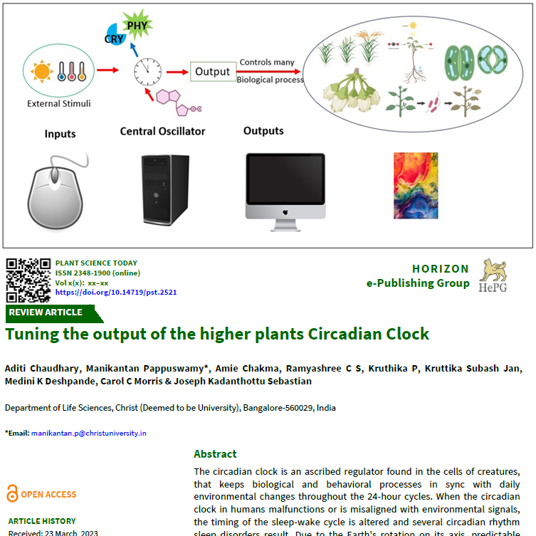 The circadian clock is an ascribed regulator found in the cells of creatures, that keeps biological and behavioral processes in sync with daily environmental changes throughout two 24-hour cycles. When the circadian clock in humans malfunctions or is misaligned with environmental signals, the timing of the sleep-wake cycle is altered and several circadian rhythm sleep disorders result. Due to the Earth's rotation on its axis, predictable environmental changes are anticipated by complex processes. The combined term for these systems is the circadian clock. The circadian rhythm regulates photosynthesis, photoperiodism, and photoperiodism, making it the "primary controller of plant life." The circadian clock is made up of post-translational alterations to core oscillators, epigenetic tweaks to DNA and histones, and autoregulatory feedback loops in transcription. In addition, the circadian clock is cell-autonomous and regulates the circadian rhythms of distinct organs. Biochemical elements such as photosynthetic products, mineral nutrients, calcium ions, and hormones are used by the core oscillators to communicate with one another. Arabidopsis is utilized to identify clock-related genes that govern plant growth, germination, pollination, flowering, abiotic and biotic stress responses, and more. The biological cycles of all species, notably humans, are undoubtedly impacted by other elements, including high altitude and changing ecosystems, in addition to the ones already stated. Although it hasn't yet published any experimental or scientific evidence to support them, the implication that living things have lives does appear inescapable. Hence, the present study elaborates on the higher plants related to the circadian clock.