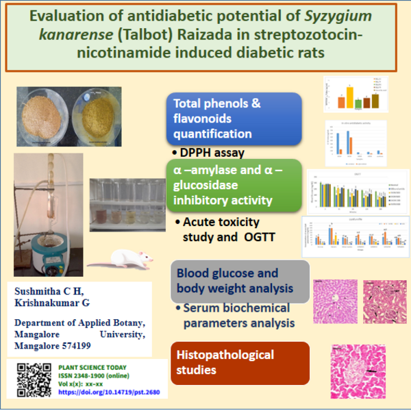 Worldwide diabetes is the major killer disease and the antidiabetic drugs which are in use cause many side effects. Traditionally, some of the Syzygium spp. are in use for treating diabetes, and many species are being assessed for their antidiabetic property. This study is to assess the antidiabetic effectiveness of the bark of Syzygium kanarense (Talbot) Raizada. The antidiabetic efficacy of methanol and water extracts of the leaf (SKLM, SKLW) and the bark (SKBM, SKBW) were evaluated in vitro by the alpha-glucosidase- and alpha-amylase-inhibitory assays. The in vivo antidiabetic activity of the bark was assessed by oral glucose tolerance test (OGTT) and streptozotocin- nicotinamide (STZ-NA)-induced non-obese type 2 diabetic rat model. The serum biochemical parameters and histopathology of the pancreas, liver and kidney were evaluated after 21 days of treatment. The total phenolics and flavonoids were quantified in all the extracts. The antioxidant activity was assessed using the DPPH assay. Administration of SKBM and SKBW to STZ-NA-induced diabetic rats at 300 mg/kg and 600 mg/kg orally for 21 days exhibited statistically significant (P < 0.001) and dose-related drop in blood sugar levels, serum lipid and hepatorenal parameters. The extract-treated rats showed rejuvenated islets and increased beta-cell density in the pancreas, improved liver architecture and glomerular regeneration without fat deposition. Bark extracts showed the strongest alpha –glucosidase- and alpha –amylase-inhibitory activity in contrast to the leaf extracts. Antioxidants, phytoconstituents and antidiabetic action, as well as protection against free radical damage, were proved to be significantly correlated.