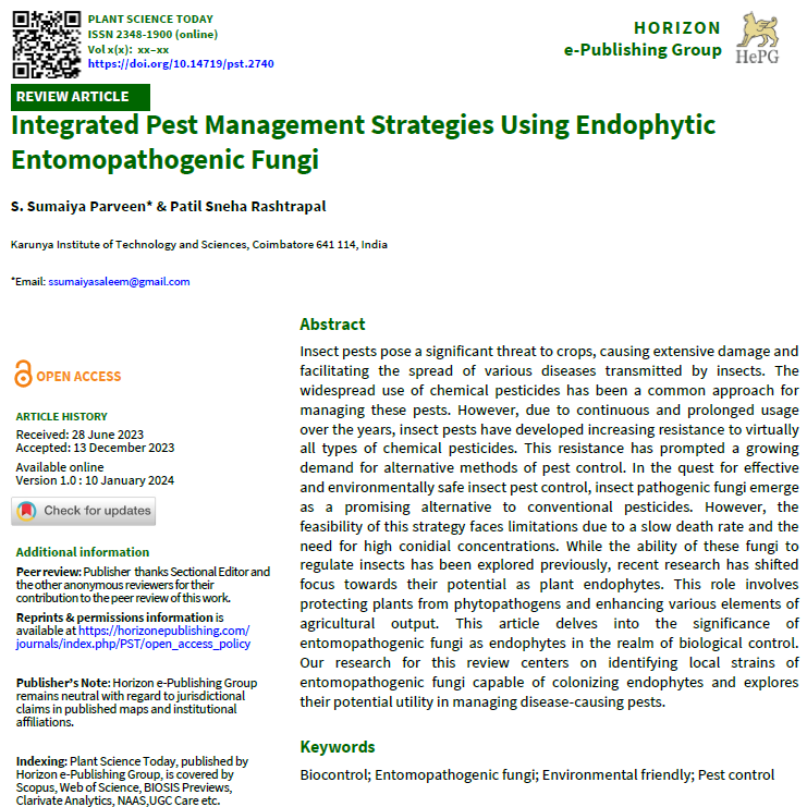 Insect pests harm crops severely and disperse a wide range of diseases that are transmitted by insects. Chemical pesticides are frequently used to manage them. Due to their constant usage over many years, insect pests have become increasingly resistant to practically all kinds of chemical pesticides, which has increased the demand for alternatives. For effective and environmentally safe insect pest control, insect pathogenic fungi are seen to be a viable alternative to practically all kinds of conventional pesticides. However, the viability of this strategy is being constrained by the sluggish death rate and necessity of large conidial concentrations. The ability of these fungi to regulate insects has previously been examined, but more recent research has focused on their potential to operate as plant endophytes to protect plants from phytopathogens and enhance other elements of agricultural output. The significance of these entomopathogenic fungi as endophytes in the context of biological control is discussed in this article. Finding local strains of entomopathogenic fungi that can colonise endophytes and their possible utility in the management of disease-causing pests are the main goals of our research for this review.