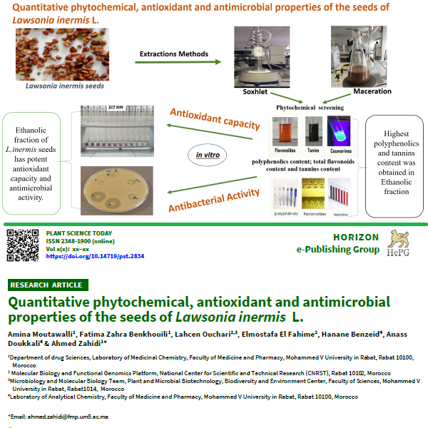 Lawsonia inermis, commonly known as Henna, is a plant that has been extensively utilized throughout the ages for its medicinal and cosmetic properties. This plant contains a variety of bioactive compounds and has attracted significant interest due to its potential antioxidant and antimicrobial activities. The aim of our study is to evaluate the antioxidant capacity and antibacterial activity of Lawsonia inermis seeds. L. inermis seed powder was extracted using hexane, dichloromethane, ethanol and water. The 4 fractions were quantified for polyphenols, flavonoids and tannins contents. The antioxidant capacity was assessed using 4 methods: 2,2?-Diphenyl- picrylhydrazyl hydrate (DPPH) , 2,2'-azino-bis(3-ethylbenzothiazoline-6-sulfonic) (ABTS), Ferric Reducing Antioxidant Power (FRAP), and Phosphomolybdate assay (PMA). Antimicrobial activity was determined by agar diffusion against Staphylococcus aureus, Bacillus cereus, Enterococcus faecalis, Escherichia coli, Pseudomonas aeruginosa and Candida albicans. The liquid dilution method was used to determine the minimum inhibitory concentration, minimum bactericidal concentration and minimum fungicidal concentration. The highest content of polyphenols and tannins was obtained in the ethanolic fraction, with values of 594.01±6.07 mg GAE/g dw and 242.4±1.6 mg CE/g dw respectively. The ethanolic fraction exhibited significant scavenging of free radicals (DPPH) with an IC50 of 3.06±0.01 µg/mL, lower than the IC50 of the standard quercetin (5.30±0.02 µg/mL). Moreover, the ethanolic fraction showed antimicrobial activity against S. aureus, B. cereus and E. faecalis strains, with zone of inhibition values of 15.5±0.7, 14.0±0.0 and 14.5±0.7 mm respectively. The minimum inhibitory concentration of the ethanolic fraction was found to be 1.563 mg/mL against both S. aureus and B. cereus strains, while the minimum bactericidal concentration was 3.125 mg/mL against B. cereus and 6.25 mg/mL against E. faecalis strains. L. inermis seeds exhibit significant antioxidant capacity and demonstrate antimicrobial activity. These findings indicate the potential of L. inermis seeds as a valuable source of bioactive compounds with antioxidant and antimicrobial properties.