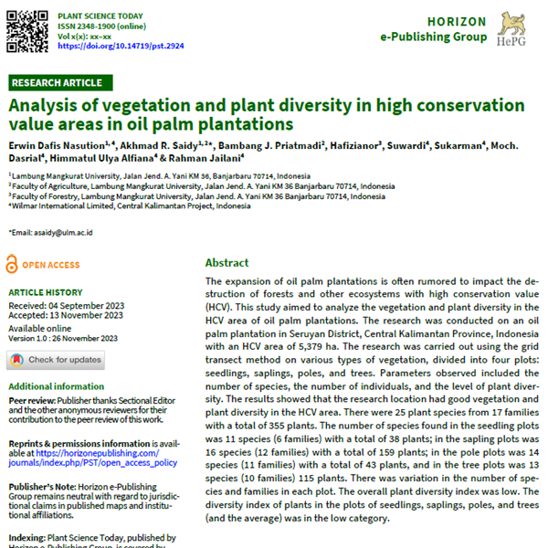 The expansion of oil palm plantations is often rumored to impact the destruction of forests and other ecosystems with high conservation value (HCV). This study aimed to analyze the vegetation and plant diversity in the HCV area of oil palm plantations. The research was conducted on an oil palm plantation in Seruyan District, Central Kalimantan Province, Indonesia with an HCV area of 5379 ha. The research was carried out using the grid transect method on various types of vegetation, divided into four plots: seedlings, saplings, poles and trees. Parameters observed included the number of species, the number of individuals and the level of plant diversity. The results showed that the research location had good vegetation and plant diversity in the HCV area. There were 25 plant species from 17 families with a total of 355 plants. The number of species found in the seedling plots was 11 species (6 families) with a total of 38 plants; in the sapling plots was 16 species (12 families) with a total of 159 plants; in the pole plots was 14 species (11 families) with a total of 43 plants, and in the tree plots was 13 species (10 families) 115 plants. There was variation in the number of species and families in each plot. The overall plant diversity index was low. The diversity index of plants in the plots of seedlings, saplings, poles and trees (and the average) was in the low category.