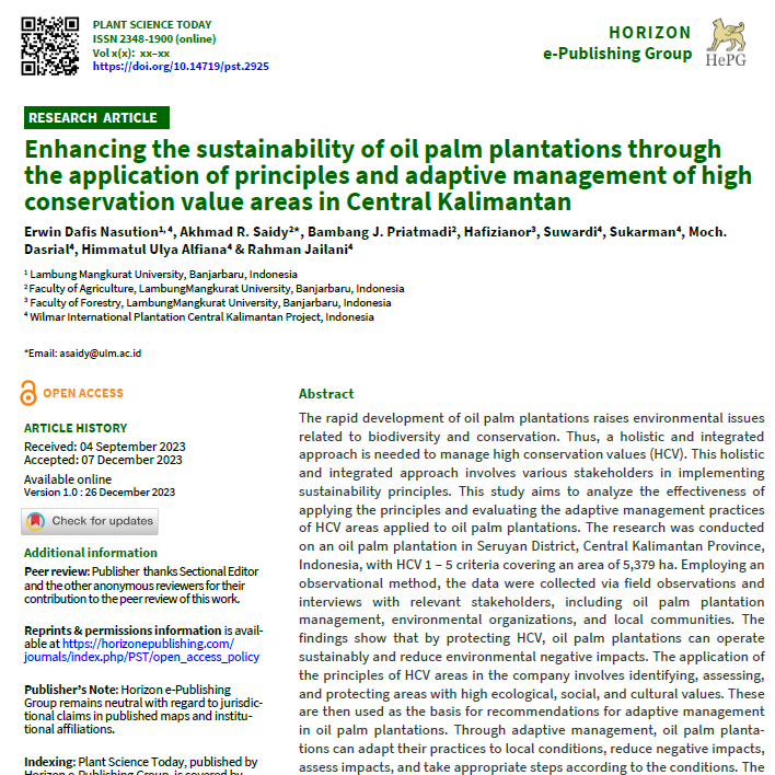 8. Santosa Y, Kwatrina RT. A preliminary study on factors determining the success of high conservation value area in oil palm plantations. International Journal of Environmental and Ecological Engineering. 2019;13(4):189-92.