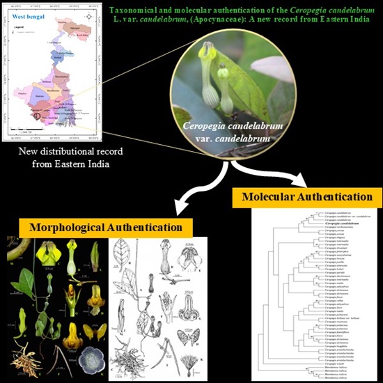 Ceropegia candelabrum L. is the lectotype of the genus Ceropegia that is native to the Western Ghats of India. This species is reporting for the first time from West Bengal, which is the eastern bottleneck of India. This species has very attractive, eye-catching flower characteristics viz., corolla-tubular; corolla tube long abruptly dilated at the base, claw is fused forming tube-like structure, corolla limb connate at the tip forming a globular cage. We apply both traditional and advanced methodologies to properly authenticate the newly collected species. However, the taxonomy, as well as the molecular (rbcL, ITS, and rbcL+ITS) data, confirm the identity of that species. Detailed morphology, a new distributional geographic area, and molecular identification are presented here.