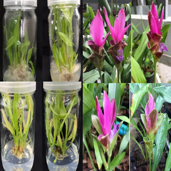 Curcuma alismatifolia (Pathumma in Thailand), also known as Siam Tulip, is an economically valuable cut flower in Thailand and is continuously bred to enhance its captivating array of colors. This study aimed to investigate the effects of acute gamma irradiation on 2 cultivars of C. alismatifolia ‘Siam Shadow’ and C. alismatifolia ‘Siam Scarlet’ for in vitro propagation and determination of the lethal dose 50 (LD50). The irradiation was conducted at doses of 0, 20, 30, 40 and 80 Gy using young shoots tissue culture. The results of the experiment revealed that the LD50 for ‘Siam Shadow’ could not be determined while ‘Siam Scarlet’ was 29.06 Gy. ‘Siam Shadow’ exhibited chimera leaf formation when exposed to a gamma irradiated dose of 40 Gy, while ‘Siam Scarlet’ exhibited chimera leaf formation when gamma irradiated at doses of 20 Gy in vitro. After planting in a greenhouse, ‘Siam Shadow’ was irradiated with 30 Gy of gamma irradiated, had reduced bract numbers and the bracts became smaller. Conversely, ‘Siam Scarlet’ irradiated with 20 Gy of gamma irradiated, produced smaller inflorescences with only 2 bracts, while irradiation with 30 Gy resulted in 2 lobes and spotted leaves at the edges of the leaves. The results indicated that both the C. alismatifolia cultivars and gamma irradiation rates had a significant influence on survival rate, number of shoots, plant height, chlorophyll mutants and morphology. As the outcome, it was determined that gamma irradiation with optimum doses of gamma rays could induce new characteristics in C. alismatifolia.