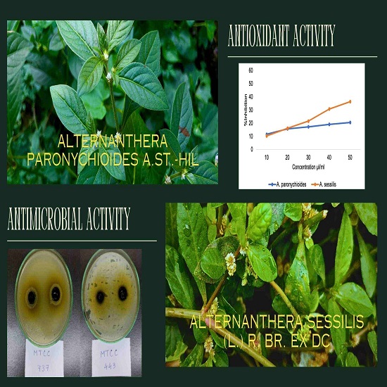 Alternanthera sessilis and Alternanthera paronychioides are 2 common herbaceous plants in the North Eastern region of India. The 2 species are known traditionally for edibility and medicinal use. The objectives are to qualitatively screen phytochemicals and test for antioxidant activity and antimicrobial activity between the 2 species– Alternanthera sessilis and Alternanthera paronychioides. The samples for analysis were collected from aerial leaves and air-dried for phytochemical screening and biological activity tests. Antioxidant assays used are DPPH (2,2-diphenyl-1-1picrylhydrazyl), H2O2, and FRAP (ferric reducing antioxidant power) assay. For antimicrobial tests, 2 different strains of microbes were used to test the bioactivity of the plants. Phytochemical screening showed the presence of several antioxidant potential groups of phytochemicals like phenols, flavonoids, etc. Phytochemical constituents of Alternanthera sessilis showed more antioxidant potential than Alternanthera paronychioides in DPPH and H2O2 assays but Alternanthera paronychioides showed more potential than Alternanthera sessilis in FRAP assay. The phytochemicals also showed positive tests for antimicrobial activity against 2 bacterial strains, i.e., Escherichia coli (MTCC 443) and Staphylococcus aureus (MTCC 737). This study reveals the presence of phytonutrients which suggest the antioxidant and antibacterial activities exhibited by the 2 species of the family. Further exploration of phytochemicals in different aspects could lead to better-performing drugs for various ailments.